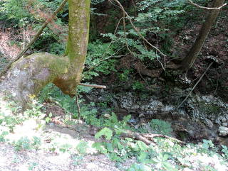 Za drugo kamnino – tuf – imamo vodniki-animatorji na voljo dve lokaciji – pri kovinski oznaki je potrebno splezati do potoka, da lahko pobereš kak kos tufa, tokrat pa nam je nadvse prav prišla točka, kjer se peščenjak in tuf prvič opazno zamenjata v cestnem bregu.
