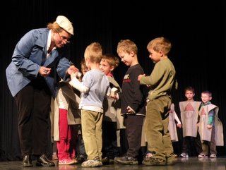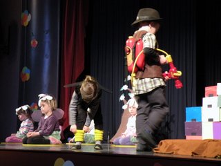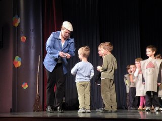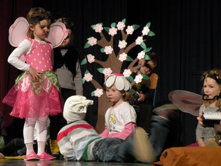 Kako čudovito znajo vzgojiteljice motivirati otroke v starosti od 3 do 5 let, da se na odru igrajo, plešejo, nastopajo, tudi same so v kostumih nastopile skupaj z otroki.