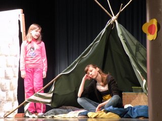 Medtem, ko so za zaveso hiteli pripravljati sceno za naslednjo predstavo, je Mojca na oder povabila prostovoljce in oživljala stare igre. A je kaj trden most?