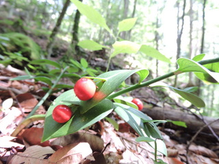 Posebno odkritje naju je čakalo že blizu slapa. Rastlina z rdečim plodom v zalistju je širokolistna lobodika. pri kateri veliki široki listi sploh niso listi, ampak v liste spremenjeno sploščeno steblo (filokladij). Je še ena – bodeča lobodika, ki ima na koncu listov bodičko. Obe sta zavarovani.