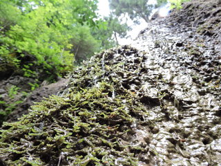 V tem času voda preko mahov in mogočnega lehnjakovega hrbta le curlja. Odločili sva se, da se ne vrneva po isti poti, ampak da se desno mimo slapa povzpneva v breg, nato pa se po gozdni poti do Boštetja.