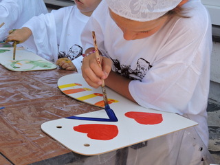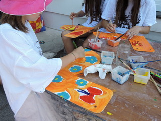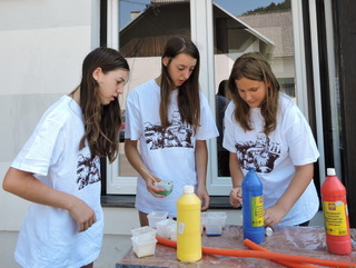 Živa, Zala in Anita so pripravile podlage in barve za mlajše udeležence delavnice.