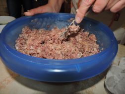 Kuhano kračo in klobaso zmelji na mesoreznico, tekočino pa prihrani za pripravo ajdovega nadeva. Narezanemu mesu dodaj 4 jajca in pol kisle smetane ter zmešaj.