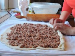 Belo testo razvaljaj v ovalno obliko. Posuj z mesnim nadevom in tesno zvij. Namesti ga v podolgovat model na peki papir in pusti da vzhaja. Pred pečenjem ga premaži s stepenim jajcem in večkrat prebodi s pletilko. Peci 3/4 ure na 180 stopinj C.