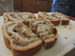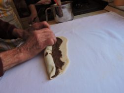 Da bi Ivanka preizkusila recept 🙂 , je že prejšnji dan spekla rožičev kolač – okrogli obliki potice reče kolač, če pa je pečena v modelu, je to potica. Zamešano testo je razdelila na 6 hlebčkov in ga pustila vzhajati. Nato je vsakega posebej razvaljala v ovalno obliko, ga namazala z rožičevim nadevom, zvila in oblikovala v kolaček (oba konca je malce namazala z beljakom, da sta se bolje sprijela). Kolački so še malo vzhajali, pred peko jih je namazala s stepenim jajcem – pekla je okrog 30 minut na 180 stopinj Celzija.