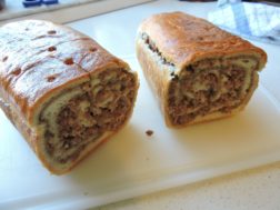 Rožičev nadev: 1/2 l mleka, 20 dag rožičev (kupiš že mlete in jih prevreš na mleku), 2 žlici slivove marmelade, 5 dag masla, 1 žlica ruma, vanilin sladkor, cimet, 1 jajce, 2 žlici piškotnih drobtin, 2 žlici sladke smetane.